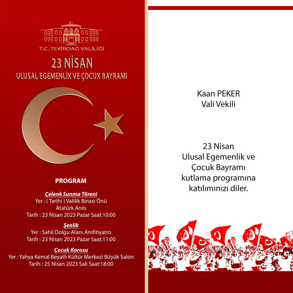 SON DAKİKA23 Nisan Ulusal Egemenlik ve Çocuk Bayramı Programı 19/04/2023 Haber Merkezi 1 dkFacebookXWhatsApp23 Nisan Ulusal Egemenlik ve Çocuk Bayramı Programı