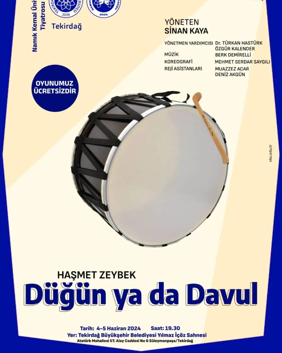 Tekirdağ Namık Kemal Üniversitesi Sağlık, Kültür ve Spor Daire Başkanlığı ve Süleymanpaşa Halk Eğitimi Merkezi iş birliğinde açılan ücretsiz tiyatro kursumuz sonunda 2023-2024 eğitim- öğretim yılının ikinci tiyatro gösterimi olan “Düğün Yada Davul’ iki perdelik Seyirlik komedi tiyatro oyunu, tiyatro severlerle buluştu.