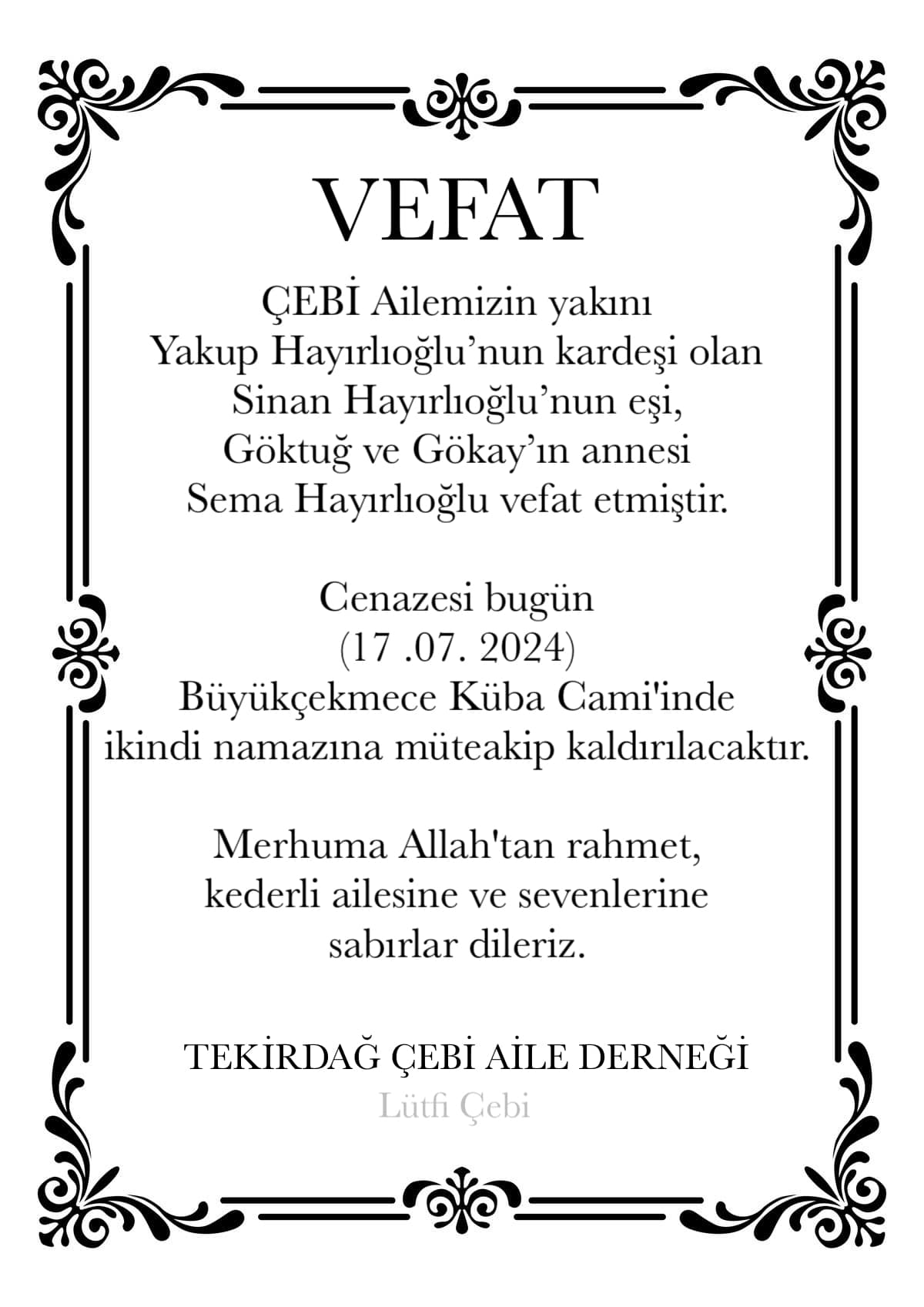 SON DAKİKA SEMA HAYIRLIOĞLU VEFAT ETTİ 17/07/2024 Haber Merkezi 1 dk FacebookXWhatsApp SEMA HAYIRLIOĞLU VEFAT ETTİ