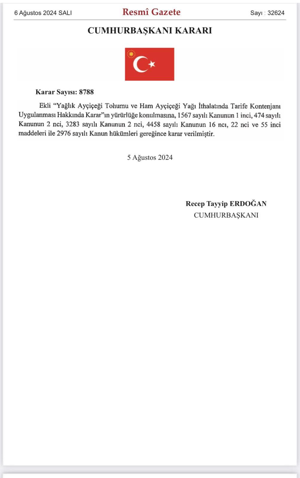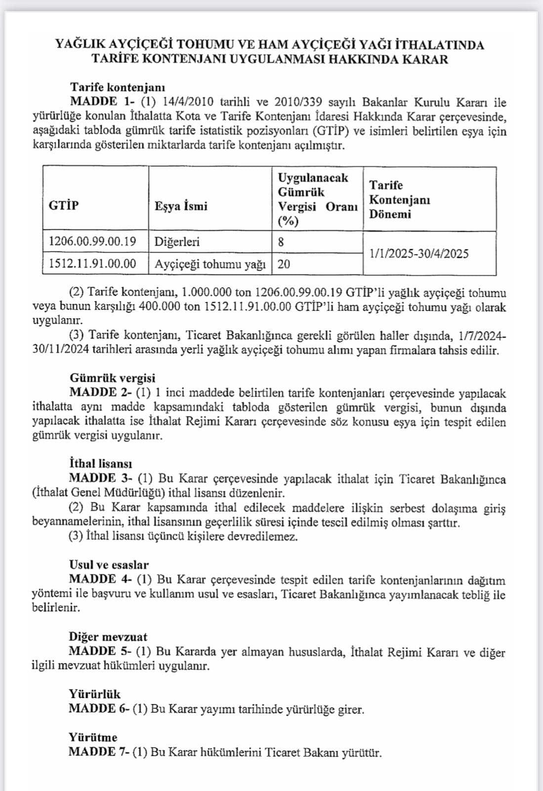 Yağlık Ayçiçeği tohumu ve Ham Ayçiçeği yağı ithalatında tarife kontenjanı uygulanması kararı Bakanlar kurulunca alınmış ve 06.08.2024 tarihli Resmi Gazetede yayımlanarak yürürlüğe girmiştir.