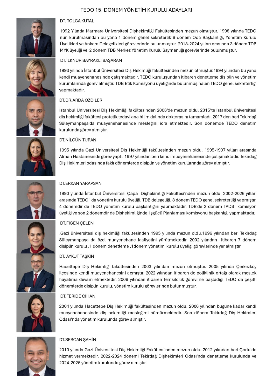 Odanın kuruluşundan bu yana farklı kademelerde görev yapan Dt. Tolga Kutal, geçmişte 6 dönem Oda Başkanlığı, Türk Dişhekimleri Birliği Merkez Yönetim Kurulu’nda ise 3 dönem görev üstlendi. Bu süreçte 2 dönem TDB Genel Saymanlığı görevini de yürüten Kutal, yeni dönemde deneyim ve istikrar vurgusuyla yola çıktıklarını ifade etti.